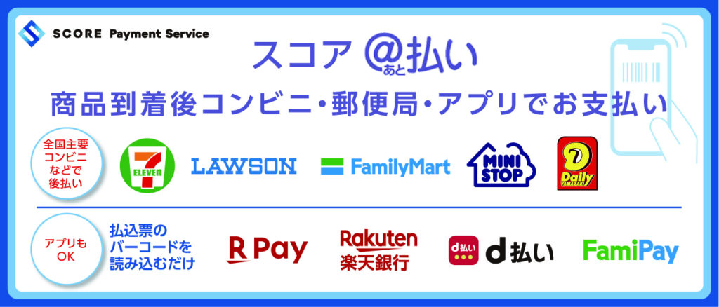 お支払には、「クレジットカード」「スコア後払い(郵便局・コンビニ後払い)」「楽天ペイ」「代金引換」がご利用いただけます。